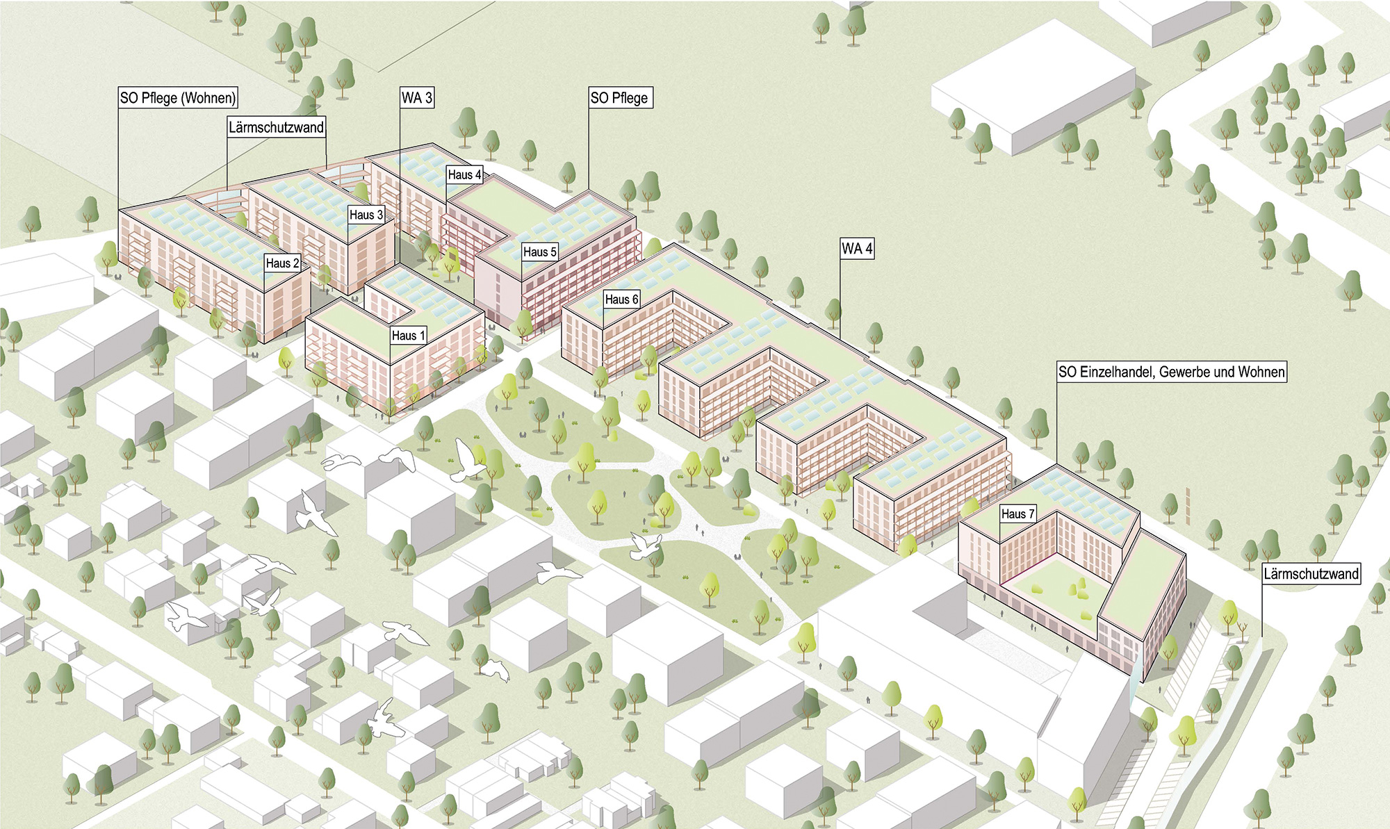 Zudem wird eine Car-Sharing und eine Fahrradservice Station errichtet. Die Dächer erhalten eine extensive Dachbegrünung, das Regenwasser wird umweltfreundlich auf dem Grundstück versickert.