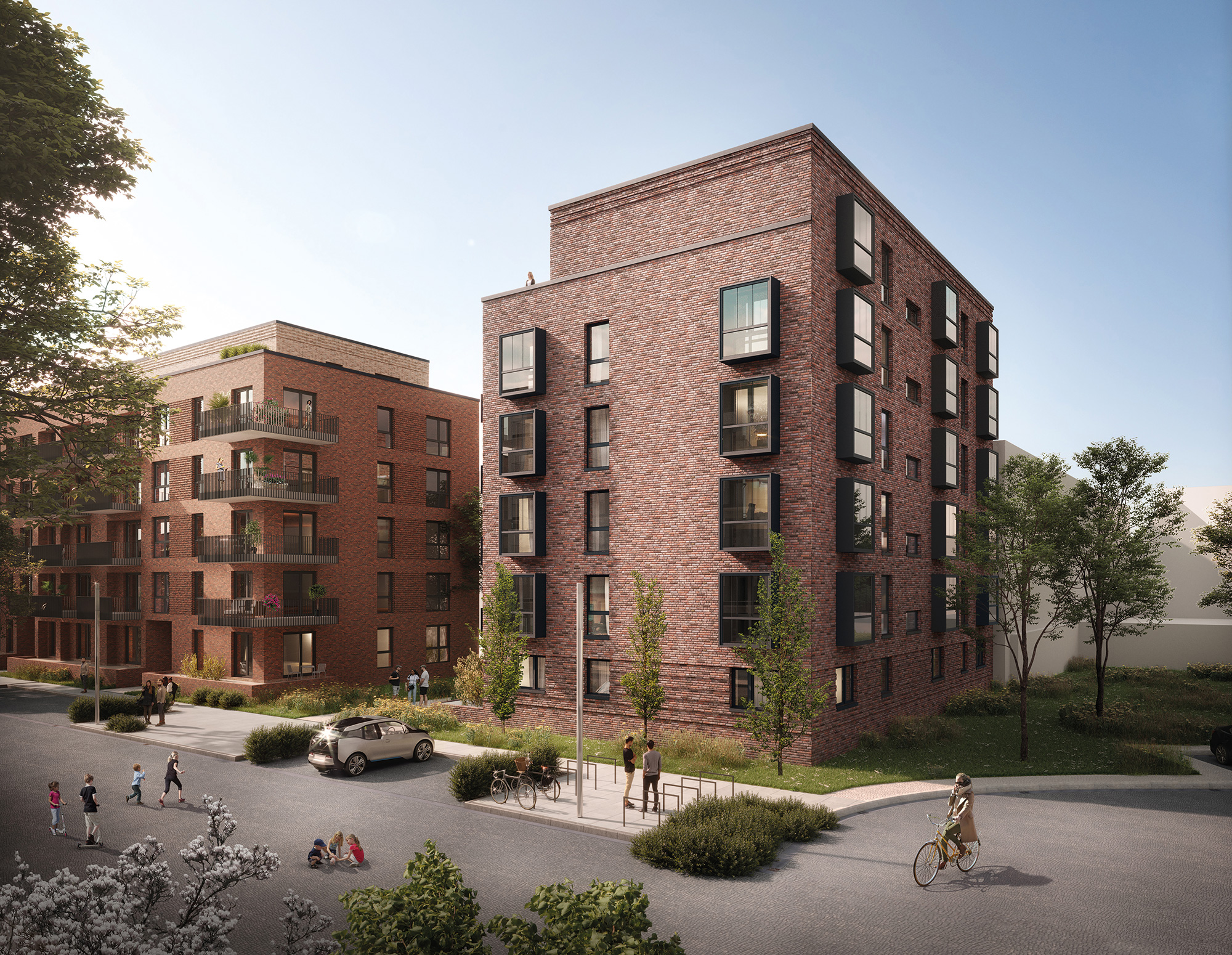 Zudem wird eine Car-Sharing und eine Fahrradservice Station errichtet. Die Dächer erhalten eine extensive Dachbegrünung, das Regenwasser wird umweltfreundlich auf dem Grundstück versickert.